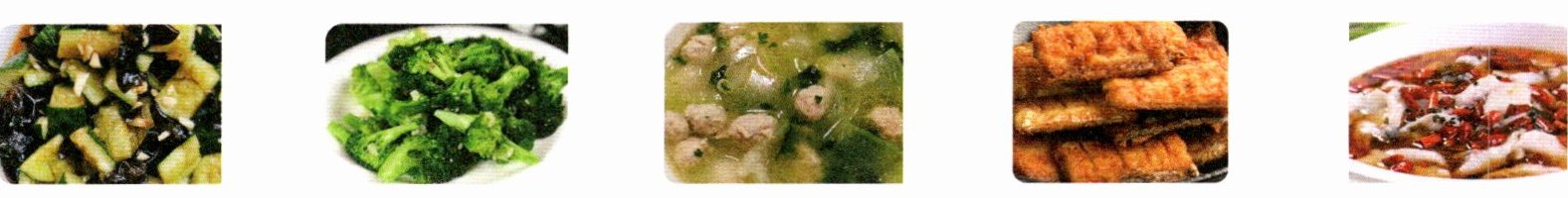 ①木耳拌黄瓜 ②清炒西蓝花 ③冬瓜氽丸子 ④香煎带鱼 ⑤水煮鱼