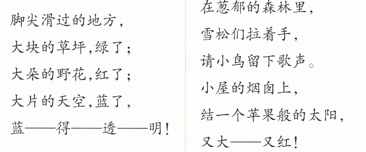 2. “小屋的烟囱上,结一个苹果般的太阳,又大——又红!”读这句话时,应该用( )的语气。