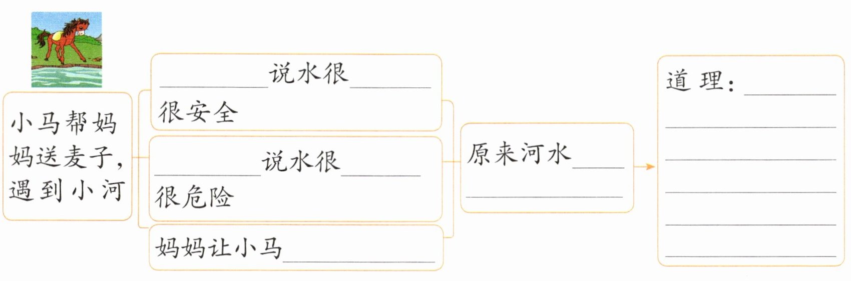 妈妈说:“那么河水到底是深还是浅呢? 你仔细想过他们的话吗?”小马低下了头,说:“没……没想过。”妈妈亲切地对小马说:“孩子,光听别人说,自己不动脑筋,不去试试,是不行的。河水是深是浅,你去试一试就知道了。”
