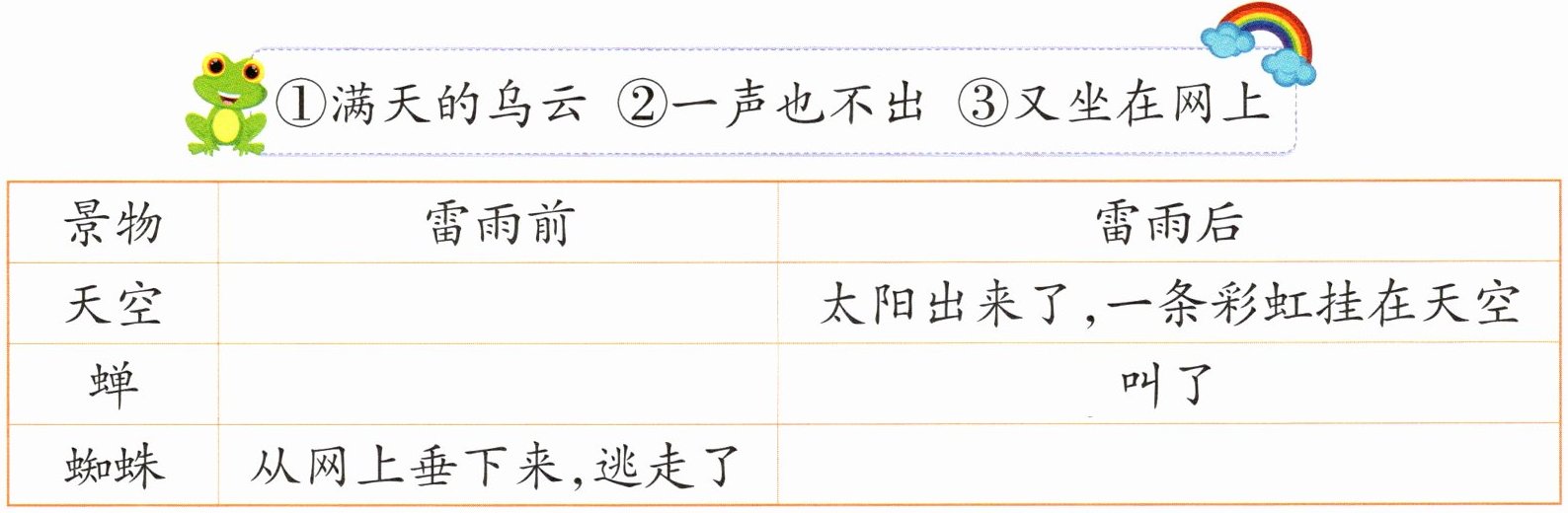 五、对比课文中雷雨前后景物的变化,选择序号补全表格。