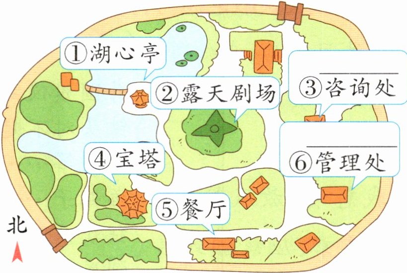 2. 不知道公园几点开门,王小明应该去______询问;想看演员跳舞,他应该去______;中午他可以去______吃饭。(填序号)