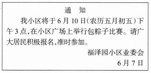 “粽叶飘香,喜迎端午”,福泽园小区将于6月10日(农历五月初五)下午3点在小区广场举行包粽子比赛,让大家在活动中感受社区大家庭的温暖。请你帮福泽园小区业委会的工作人员写一则通知。注意通知发布日期是6月7日。