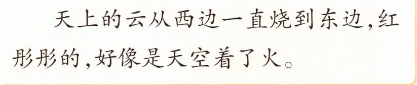 3. 这句话表现了火烧云的___________。之所以把这种现象叫火烧云,是因为天上的云从西边一直烧到东边,红彤彤的,好像是天空着了火。