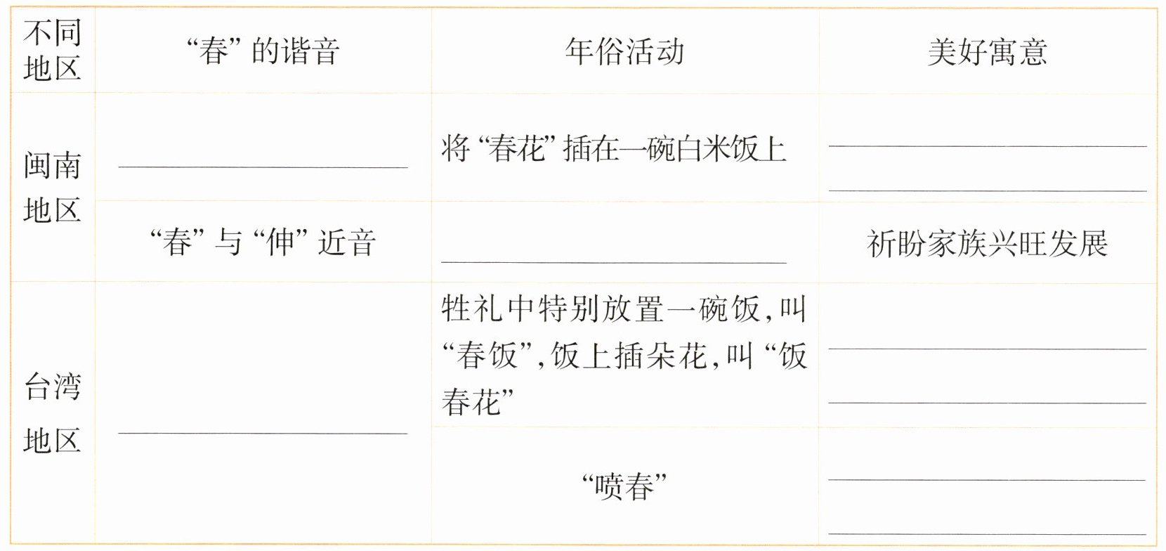 除夕夜,台湾同胞进行一年中最后一次祭祖。他们在中厅摆上牲礼花果,在牲礼中特别放置一碗饭,叫“春饭”,饭上插朵花,叫“饭春花”,也是取“春”与“剩”谐音,意为“岁岁有余粮,年年食不尽”。春节期间,台湾还有“喷春”的活动,希望年年有剩余的钱财可以存起来。闽南地区、台湾地区过年过节都爱贴“春”字,这和其他地方张贴以“年年有余”为主题的年画是一样的用意。