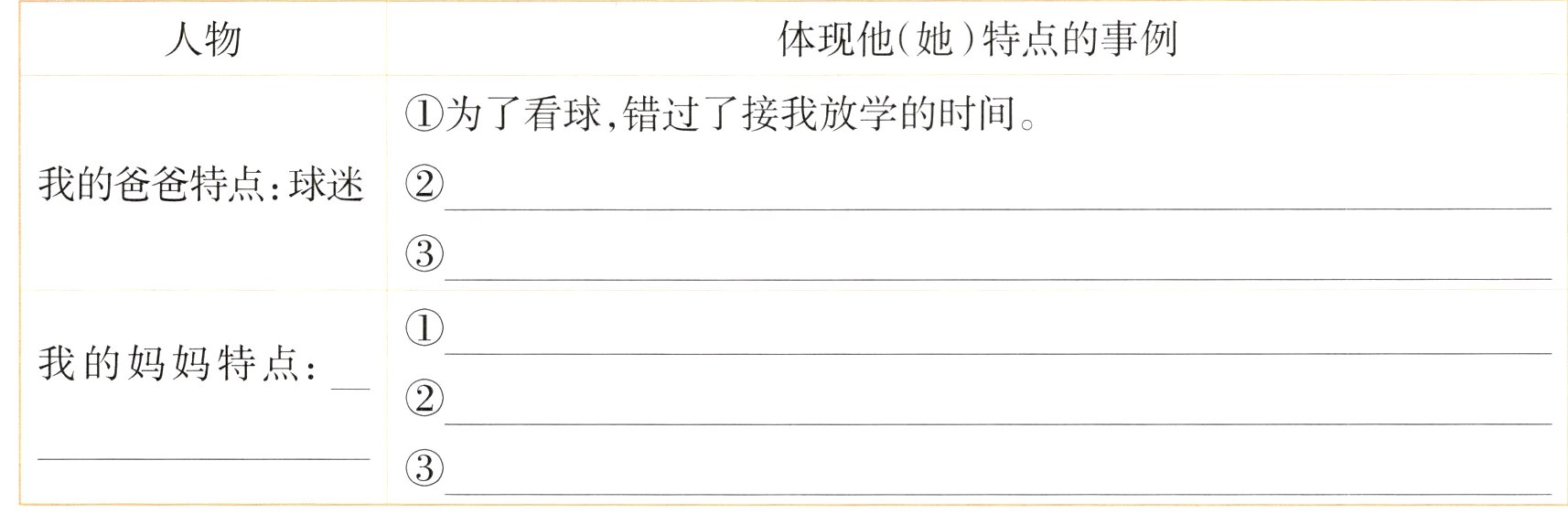 三、你的爸爸和妈妈有什么特点?是一位球迷,还是一位戏迷?是“纸老虎”,还是“领头羊”?我们来交流一下吧! (根据提示完成表格)