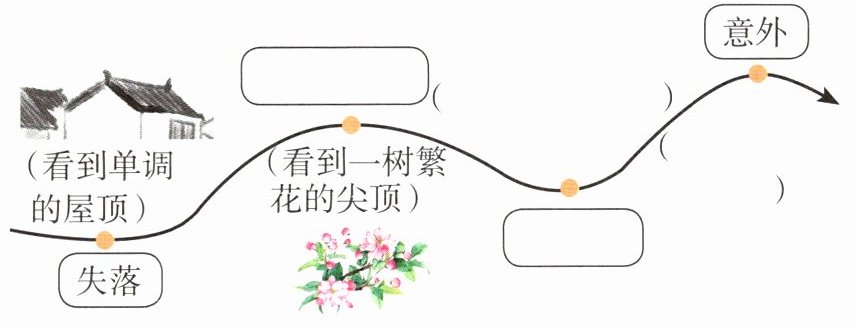 解析:本题考查整体感知的能力。作者的心情变化是串起选段的一条暗线,梳理出这条暗线,既有利于把握选段的内容,又有利于理解作者的情感。作答时,通过分析思维导图中所给的提示可知答题的思路是:找关键语句并提炼心情。根据这个思路,先找到整件事中的几个关键点,接着直接提取描写心情的词语,或者从关键句中提炼心情,即可完成练习。