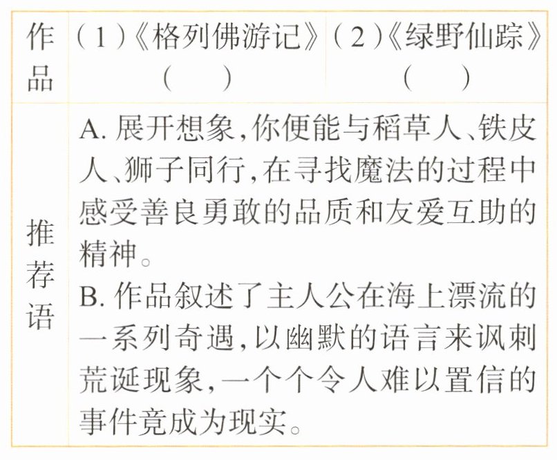 1. 在“爱阅读”行动中,我们还读了其他历险故事,请分别为以下两部作品选择合适的推荐语。