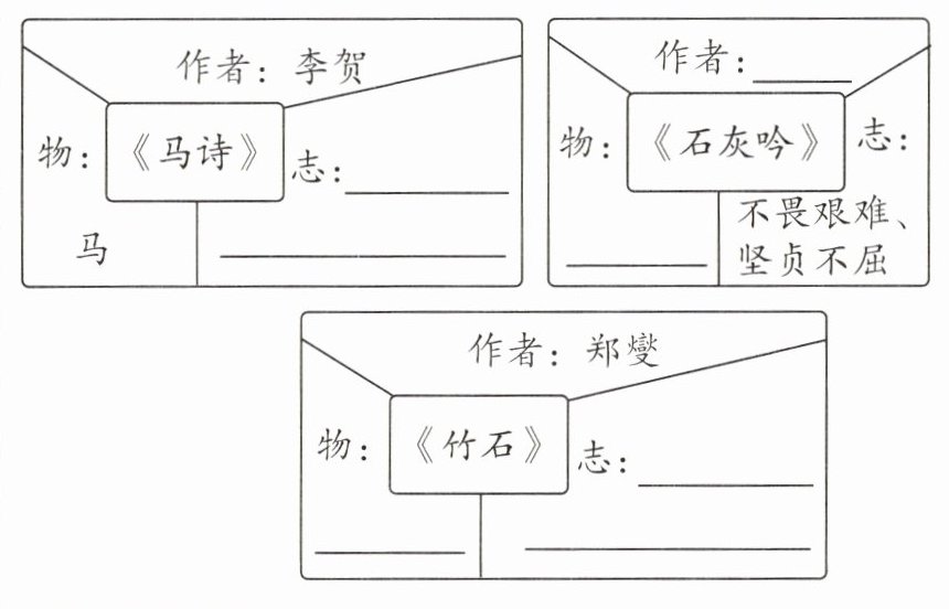 渴望建功立业的远大抱负 于谦 石灰 竹子 刚正不阿,铁骨铮铮 解析:本题考查理解古诗的能力。完成此题,要在品读诗句的过程中,将马的轻捷矫健、石灰的高洁、竹子的坚劲与诗人的自我形象融合在一起,还可以联系诗人的人生经历,体会诗人高尚的精神品质和远大的志向。如《马诗》通过咏叹马的命运,表达诗人渴望建功立业、报效国家的志向和怀才不遇的感慨;《石灰吟》以石灰作比,表达了诗人不畏艰难、坚贞不屈的高尚品质;《竹石》一诗中,诗人借竹表达了自己刚正不阿、铁骨铮铮的品格。