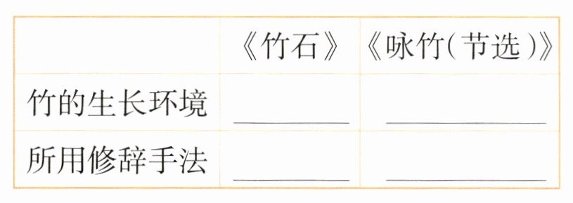 1. 这两首诗前两句都写出了竹____________________的特点,表达了诗人____________________之情,但描写的侧重点不同,请根据提示分析一下它们的不同之处,完成表格。