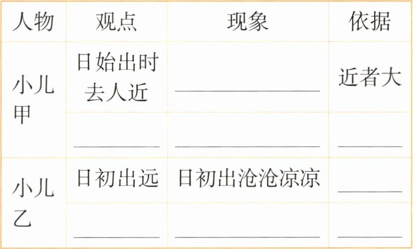 五、梳理文中两小儿辩斗的观点、现象与依据,把表格补充完整。
