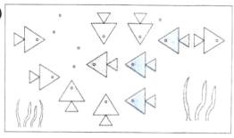 (1) 下面哪些小鱼通过平移可以与红色的小鱼重合?把它们涂上蓝色。