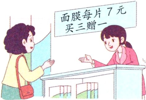 解析:先求出妈妈买面膜一共花了多少钱,用减法计算,即100 - 37=63(元)。根据题图可知,面膜每片7元,求63元可以买几片面膜,就是求63里面有几个7,用除法算式,即63÷7=9(片)。再根据“买三赠一”的信息,算一算9里面有几个3,用除法计算,求出赠送了9÷3=3(片)面膜,最后将两部分合起来就是妈妈买到的面膜总数,即9 + 3=12(片)。