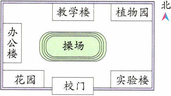 (2)实验楼在操场的( )方向,花园在操场的( )方向,植物园在操场的( )方向。