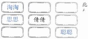 3 倩倩、思思、淘淘和聪聪去电影院看电影。根据描述在图中写出他们的位置。