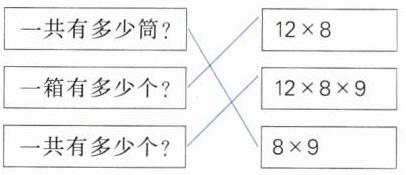 2 商店有9箱羽毛球,每箱8筒,每筒12个。把问题和对应的算式用线连起来。
