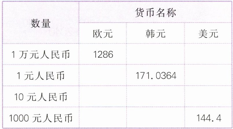 1 某日,某银行显示的人民币汇率如下表,请算一算。