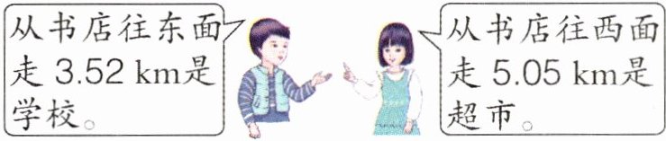 3.52km=3520m 5.05km=5050m 5050−3520=1530(m) 答:从书店到超市比从书店到学校远1530 m。