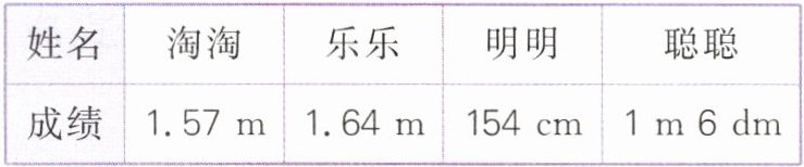 2. 运动会上,4 名跳远运动员的成绩如下。请根据成绩,把前 3 名运动员的名字写在如图所示的领奖台上。