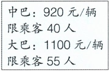 解析:分别计算大巴车和中巴车每人分别多少钱,尽量租便宜的,而且没空位,计算所需钱数即可。