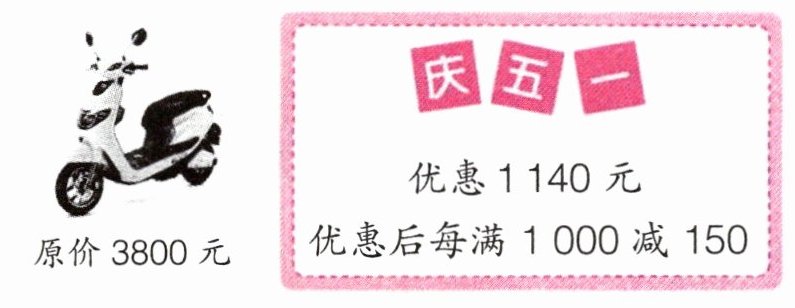1. 新兴电动车专卖店正在进行庆“五一”活动。某款电动车的优惠活动如下,请你算一算这款电动车的现价是多少元。