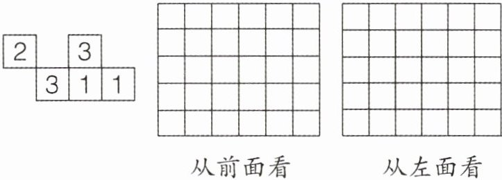 2. 由几个相同的小正方体搭成一个立体图形,从上面看到如下图,正方形上所标数字表示该位置上所用的小正方体的个数。请在下面方格中画出该立体图形从前面和左面看到的图形。