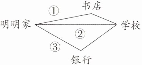 1 如图是明明家到学校的路线图,有( )条路可以走,走第( )条路最近,理由是( )。