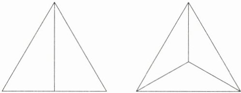5 等边三角形有一些特殊性,根据它的特殊性,我们可以把等边三角形平均分成若干个完全相同的三角形。下面分别分成了 2 个、3 个完全相同的三角形。你能再把它分成 4 个、6 个、8 个完全相同的三角形吗?