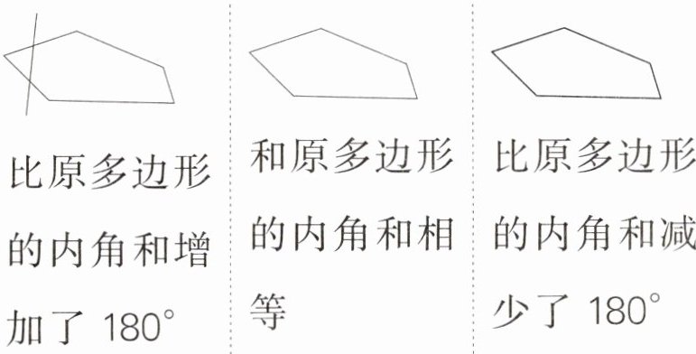 解析:比原多边形的内角和增加$180^{\circ}$,就是比原多边形增加一条边;和原多边形的内角和相等,就是和原多边形的边数相等;比原多边形的内角和减少$180^{\circ}$,就是比原多边形减少一条边。