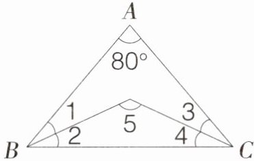 $\angle5 = 180^{\circ}-50^{\circ}=130^{\circ}$ 答:$\angle5$的度数是$130^{\circ}$。 解析:在大三角形中,$\angle1+\angle2+\angle3+\angle4 + 80^{\circ}=180^{\circ}$,因为$\angle1=\angle2$,$\angle3=\angle4$,所以$\angle1+\angle3=\angle2+\angle4=(180^{\circ}-80^{\circ})\div2 = 50^{\circ}$;在小三角形中,$\angle2+\angle4+\angle5 = 180^{\circ}$,所以$\angle5 = 180^{\circ}-50^{\circ}=130^{\circ}$。