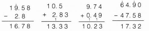 $9.74 + 0.49 =$ $64.9 - 47.58 =$