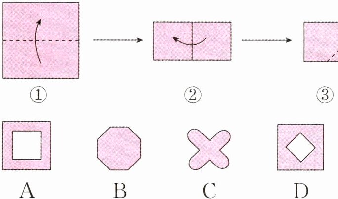 (2)剪纸是中国的一种民间艺术。小东同学在手工课上将一张正方形彩纸依次按如图①②所示的方式对折,然后沿图③中的虚线裁剪。将图③中的彩纸展开平铺后的图形是( )