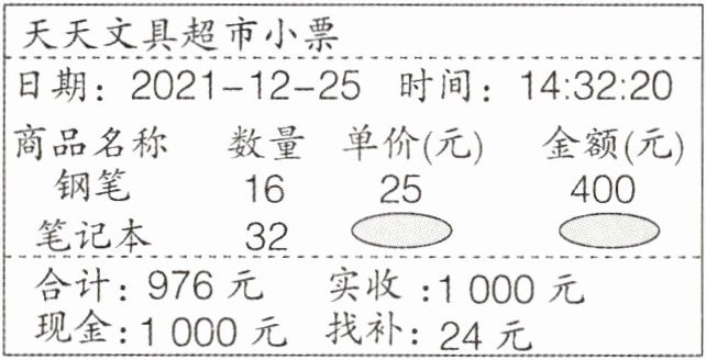 1. 如图是一张弄脏了的文具超市小票,请根据图中的信息,算出笔记本的单价。