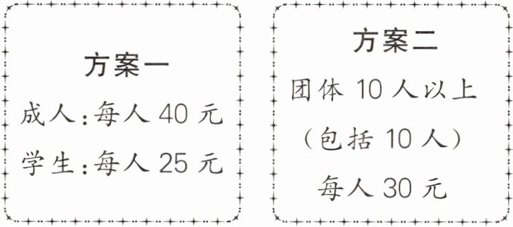 解析:方案一是 4 名成人的门票钱加上 50 名学生的门票钱;方案二是 54 人每人都是 30 元,根据“单价×数量 = 总价”计算出总钱数,再比较即可。