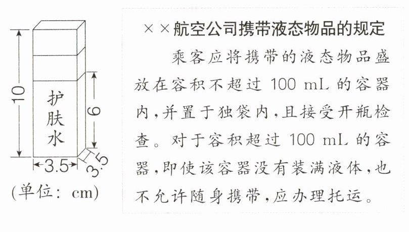 5. 乐乐妈妈准备坐飞机去外地出差,她携带了一瓶长方体形状的护肤水(如图),请你帮乐乐妈妈算一算,这瓶护肤水能不能随身携带到飞机上?(护肤水瓶的厚度忽略不计)