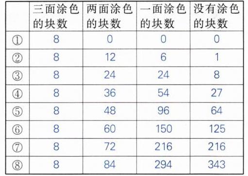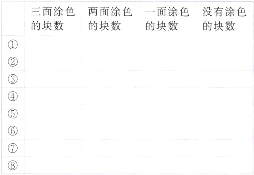 (2) 两面涂色的小正方体位于棱的中间,每条棱上有( )块,共有( )块。