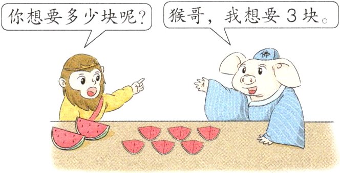 7. 孙悟空买来1个西瓜,平均分成4块,打算给师徒4人每人1块,猪八戒看到只能分到1块,很不高兴,要求孙悟空再多给他几块。