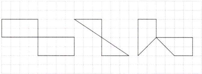 (1)左图:将左(或右)边的长方形向下(或上)平移2格,就能变成一个长方形。中图:将上面的三角形先向右平移3格,再向下平移2格,就能变成一个长方形。或将下面的图形先向左平移3格,再向上平移2格,就能变成一个长方形。右图:以两个梯形的公共顶点为中心,将右边(或左边)的梯形顺(或逆)时针旋转90°,就能变成一个长方形。