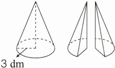6 一个圆锥的底面半径是$3\ dm$。从圆锥的顶点沿着高将它切成相等的两半后,表面积比原来的圆锥表面积增加了$24\ dm^{2}$。这个圆锥的体积是多少立方分米?