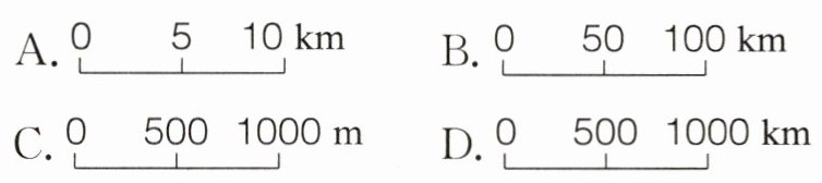 (2)一幅地图的比例尺是 1 : 5000000,用线段比例尺表示正确的是 ( )