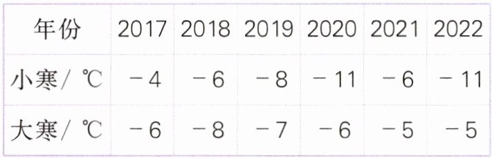 (1)2022年该地小寒当天最低气温是( )℃,大寒当天最低气温是( )℃,相差( )℃。