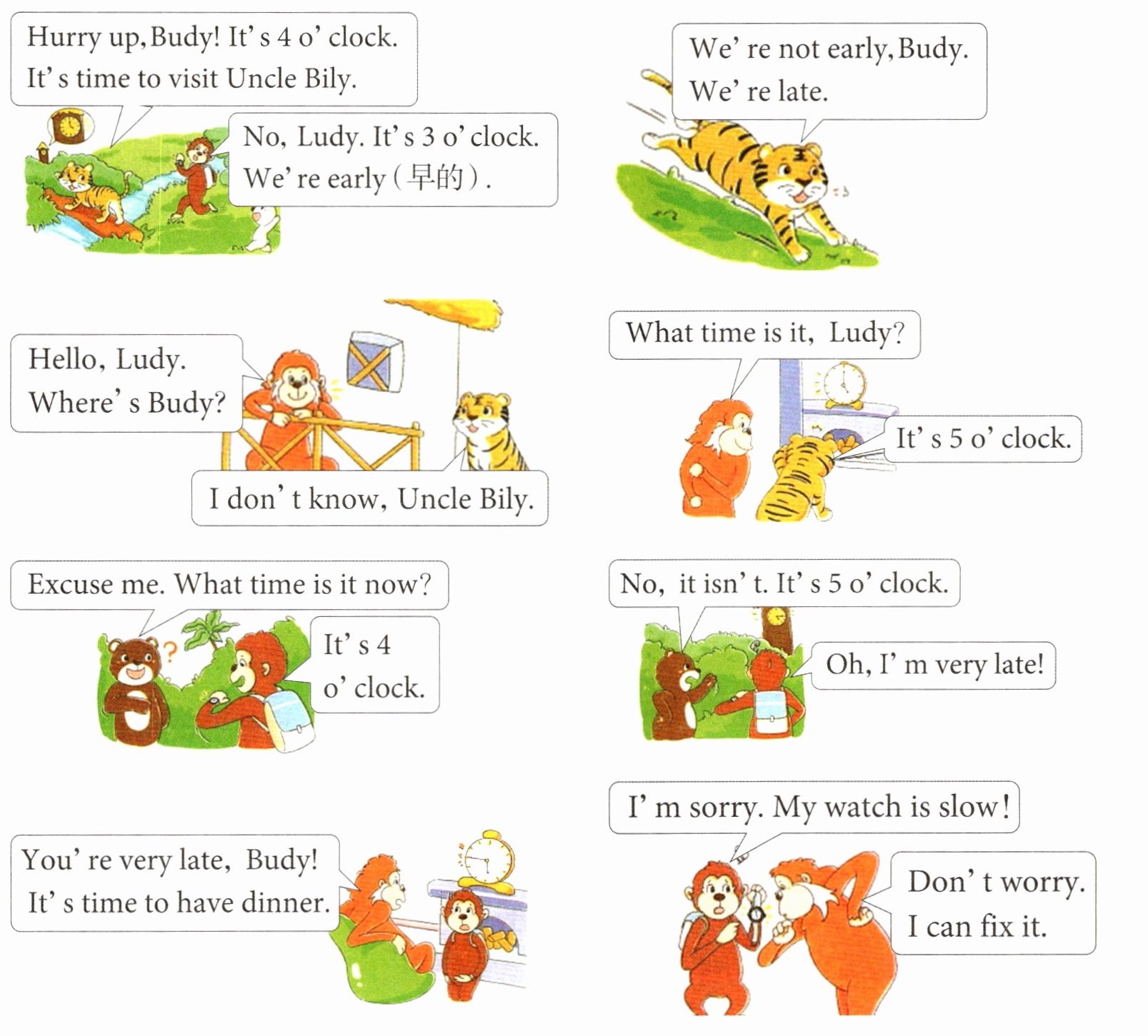 二、小老虎Ludy和小猴子Budy是好朋友,一天他们约好一起去看望Bily叔叔,但途中发生了什么情况呢?他们都按时到达了吗?读下面的绘本故事,判断下列句子是( T )否( F )正确。