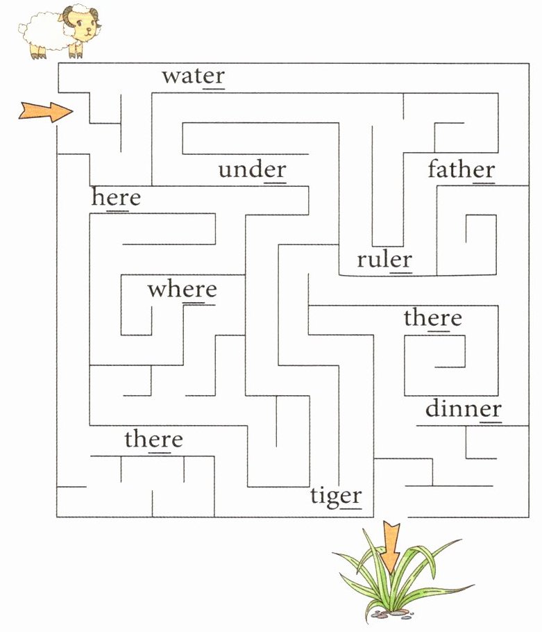 二、走迷宫:沿着与 sister 画线部分读音相同的单词走,小羊才能成功走出迷宫吃到草哦!