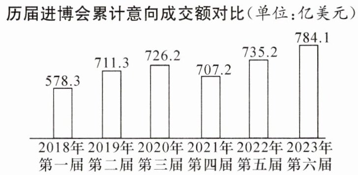 6. $(2024·$临沂中考)2023年11月5日,第六届中国国际进口博览会(以下简称“进博会$”)$在上海开幕。小鲁所在的九年级(1)班围绕“走进进博会”开展项目式学习。下面是同学们在学习过程中做的历届进博会累计意向成交额对比(如图所示)。