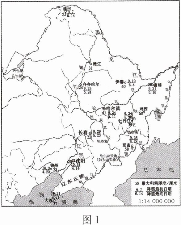 1. (河南中考)为振兴东北经济,黑龙江省积极布局新兴产业,构建新发展格局。图1为东北三省雪期初期、终期及雪厚分布示意图。阅读图文材料,回答下列问题。
