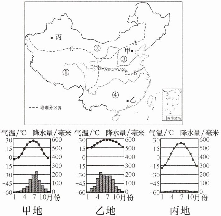 13.(无锡中考)下图是我国四大地理区域及甲、乙、丙三地气候资料示意图,读图完成下列各题。
