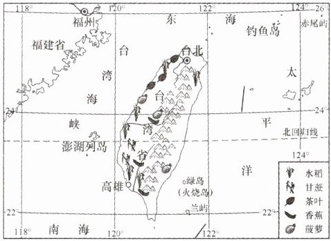 下图示意台湾岛主要农产品的分布。读图,完成3~5题。