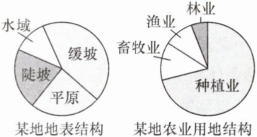 读我国江南丘陵某地地表结构和农业用地结构饼状图,完成3~4题。
