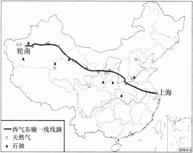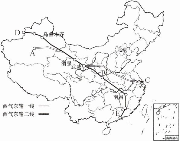 (2 )西气东输二线工程起点为D城市__________,终点为E城市________,终点所在省份的简称是______。该工程所运输的天然气来自 ( )