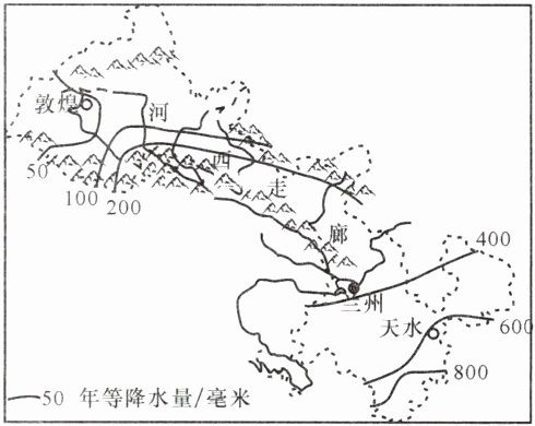 (潍坊中考)河西走廊位于丝绸之路经济带上,文物古迹众多,也是我国目前最大的玉米制种基地。近年来,该地制种业结构不断变化,蔬菜、瓜果、花卉等制种规模迅速扩大。下图示意甘肃省地形与降水的分布。据此完成4~5题。