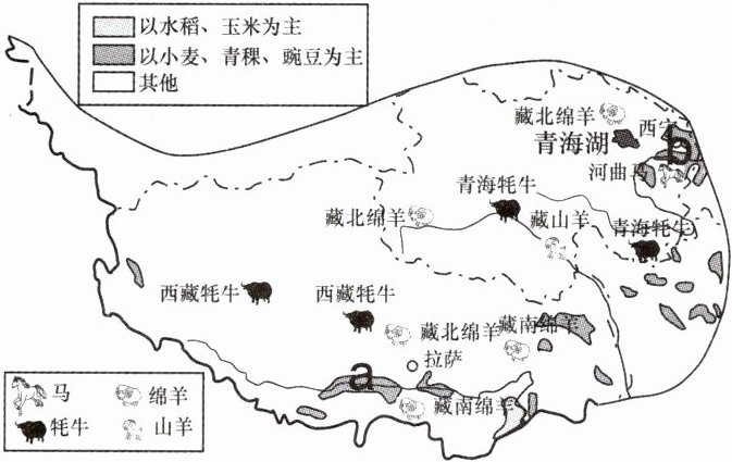8. 读青藏地区农牧业的分布图,完成下列各题。